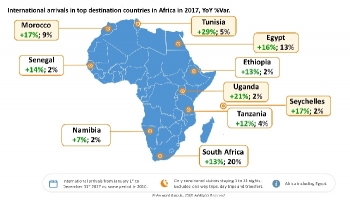 В Африке впечатляющий рост зафиксировал Тунис, — турпоток на 29% больше, чем в предыдущем году. Страна пережила три террористических акта в 2015 году, что привело к разрушению её индустрии туризма. В конце 2016 года европейские туристы начали возвращаться назад, а в июле 2017 года правительство Великобритании отказалось от запрета на поездки в страну.