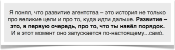 • «Хороший» менеджер в «хорошей» системе расцветёт, и в этот момент как раз произойдёт то, что нужно агентству для развития — он станет больше, чем менеджером. А для развития агентства нужны именно такие люди: те, на кого можно положиться, те, кому можно доверить офис или поставить нестандартную задачу.