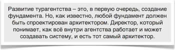 Пока в турагентстве нет крепкого фундамента, состоящего из системы (задающей правила игры и обеспечивающей автономную работу основных бизнес-процессов) и команды, которая по этой системе работает, ни о каком развитии не может быть и речи — любые попытки перейти на следующий уровень, будут приводить к коллапсу.
