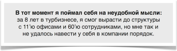 Важный момент: я ни в чём их не виню. Это не они «какие-то не такие». Это я не организовал работу в компании так, как должен был. И я очень благодарен им за то, что сейчас они вместе со мной наводят в компании порядок. Без поддержки команды, сделать такую работу невозможно.