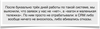 Я никого не пытаюсь как-то унизить или обидеть. Моя задача — сделать так, чтобы по каждой заявке мы отработали с максимальной конверсией. Заявка некачественная? Ок — на прослушке мы это услышим. Например, отработал менеджер по скрипту, а клиент не собирался ничего покупать. И мы увидим общую картину по каналу — из него же действительно могут идти плохие заявки. Мы это учтём и подключим другой канал. Но если менеджер не делает то, что надо делать — не звонит клиенту, говорит с ним не так,