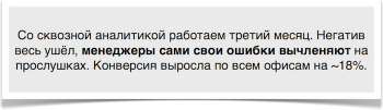 Поэтому каждый день я приезжал в офис в 8:00, смотрел отчёт по заявкам, читал переписки в соцсетях, отбирал записи звонков, набирал по скайпу каждый офис и, вместе с менеджерами и «старшими» проводил анализ значимых звонков.